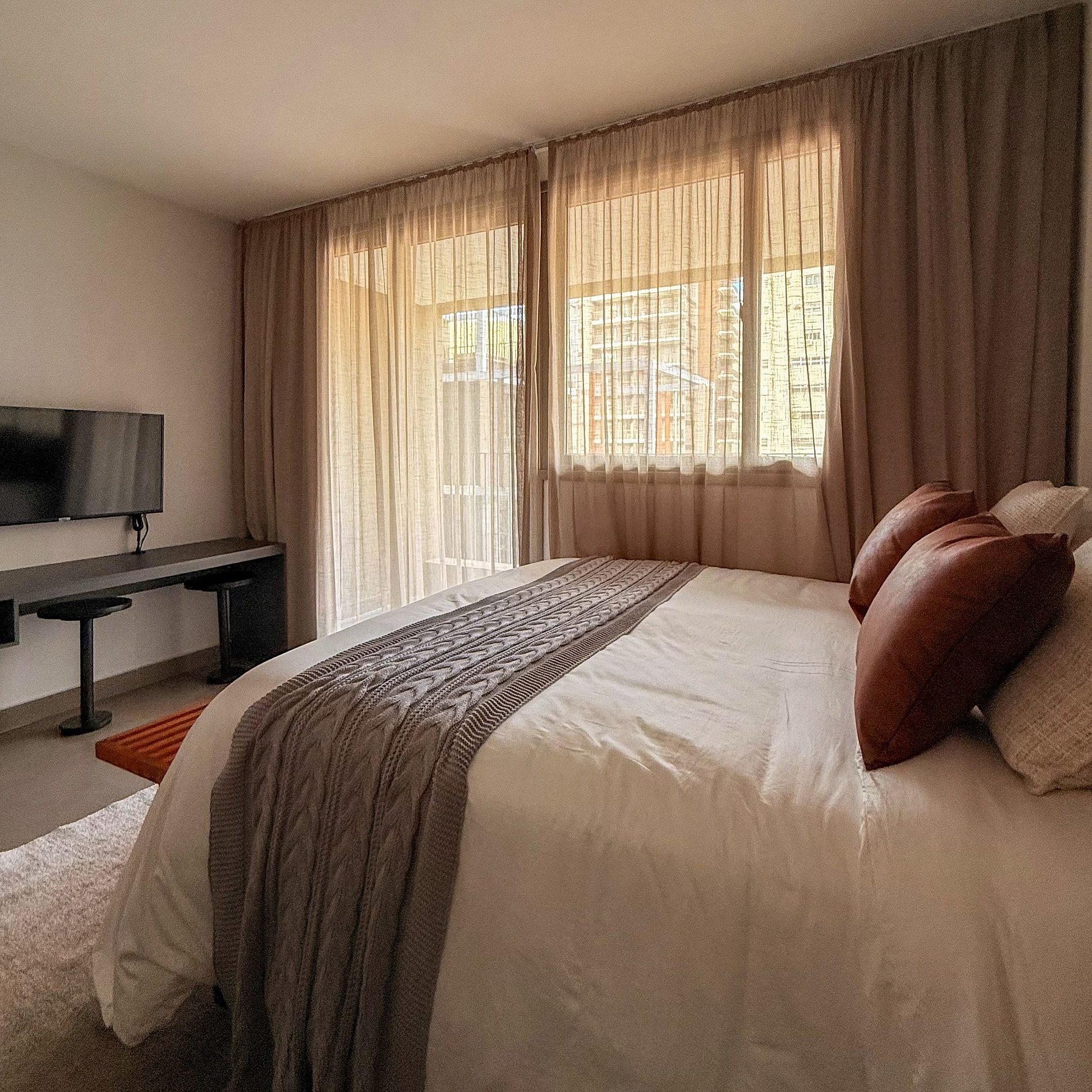 A cama confortável com enxoval branco de padrão hoteleiro garante boas noites de descanso. A janela com cortinas translúcidas permite luz natural durante o dia, mantendo privacidade.