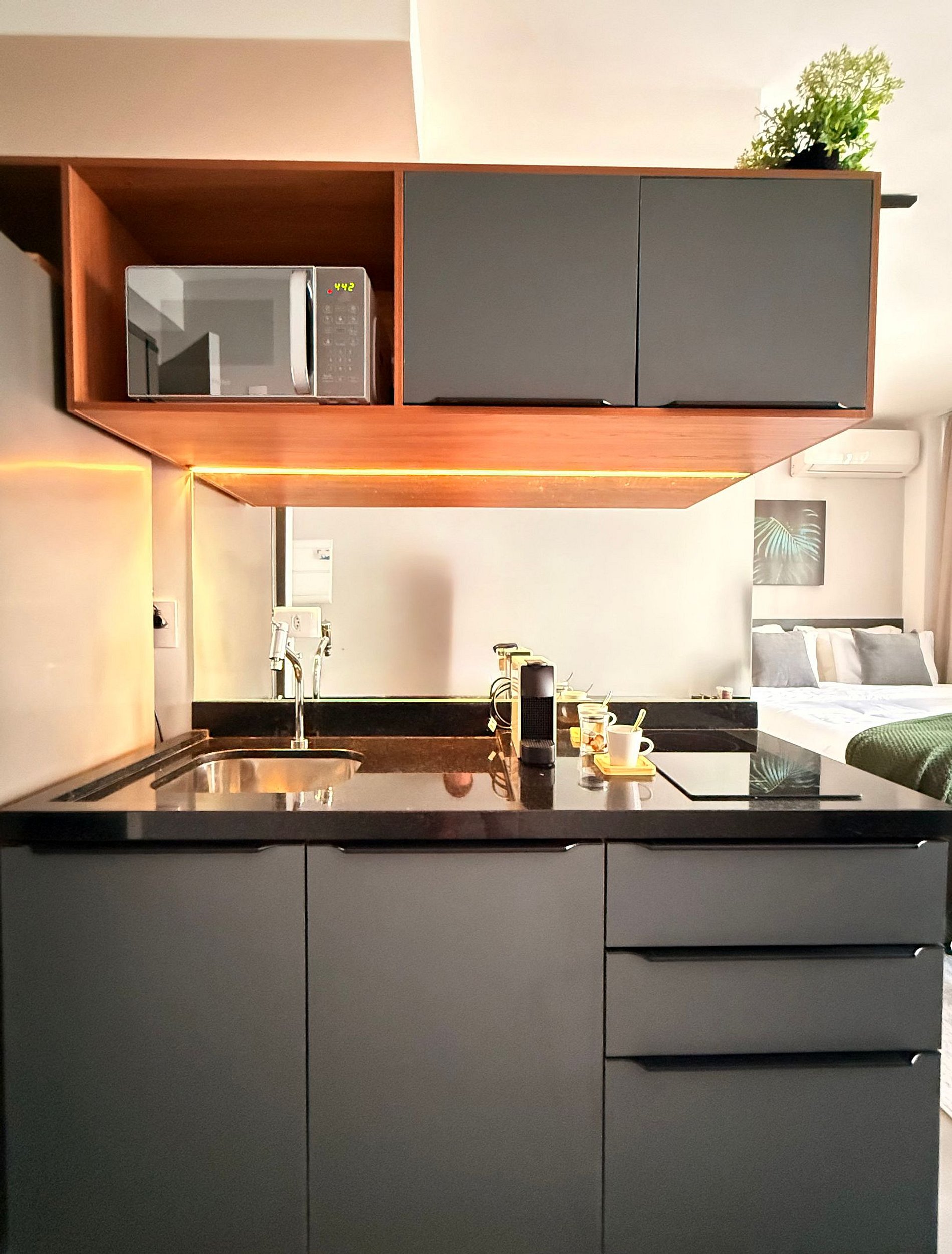 A cozinha integrada é equipada para refeições simples. O espaço conta ainda com mesa para trabalho ou refeições, Wi-Fi rápido, ar-condicionado e banheiro privativo, moderno e bem iluminado.