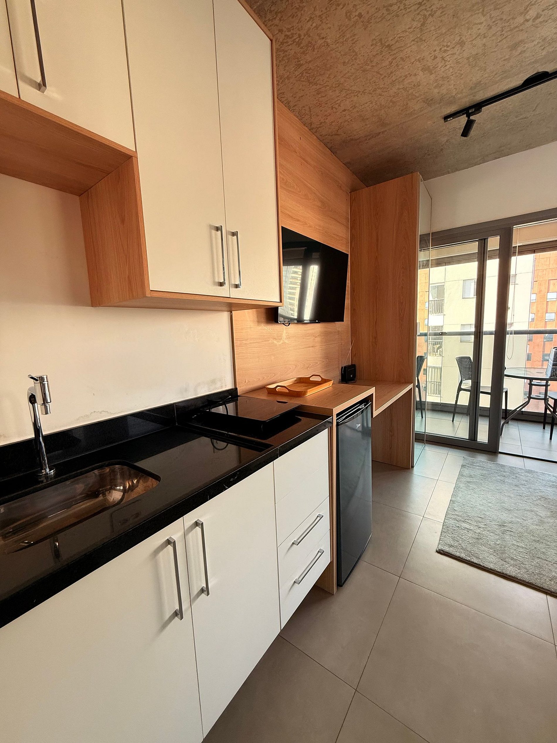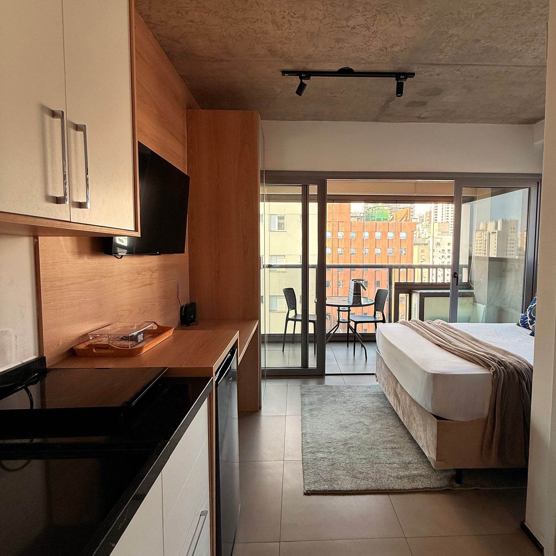 - Studio completo com cama casal confortável, TV e cozinha equipada.
