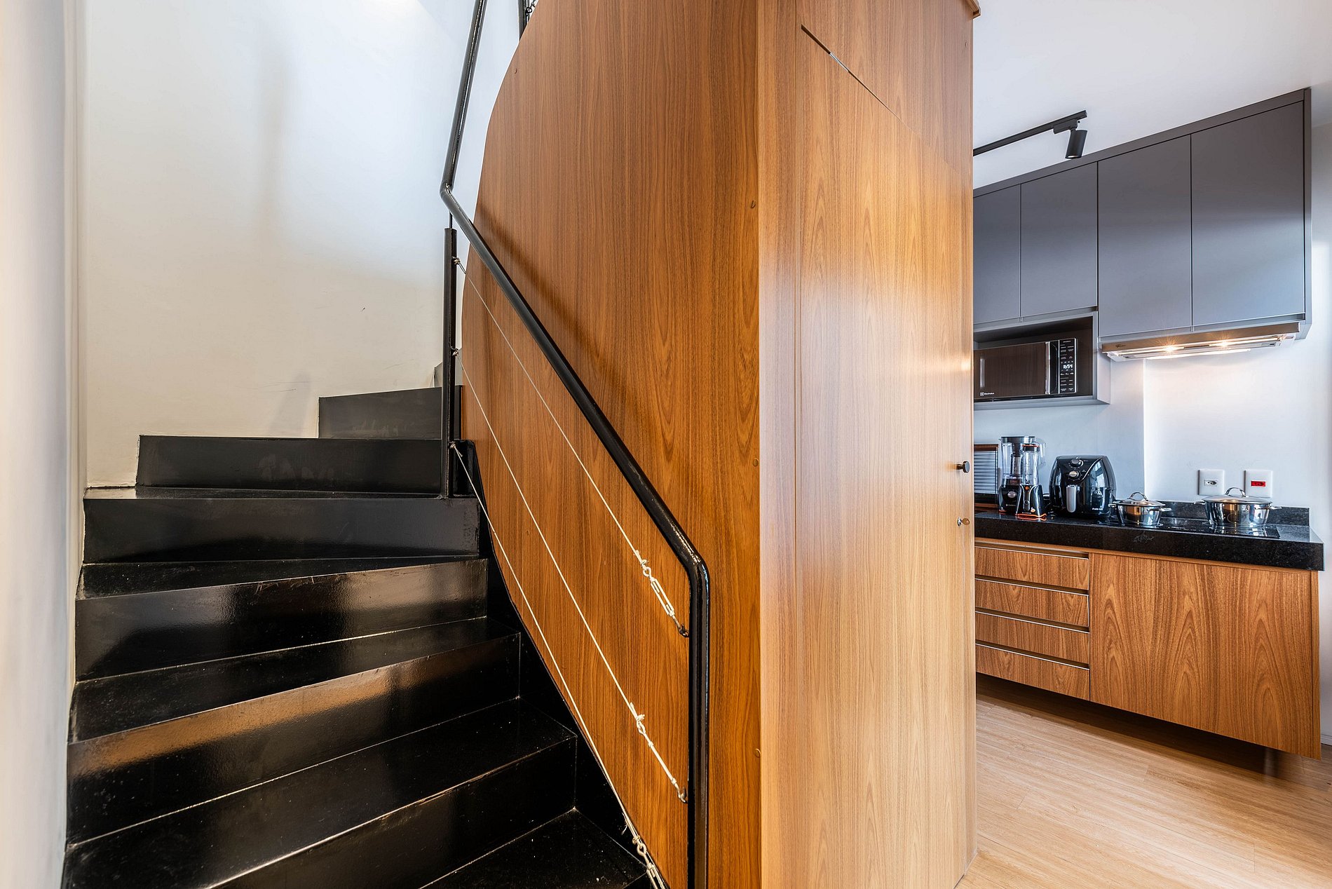 O duplex se organiza em dois níveis bem definidos, com uma área social integrada e iluminada e um andar superior dedicado ao descanso.