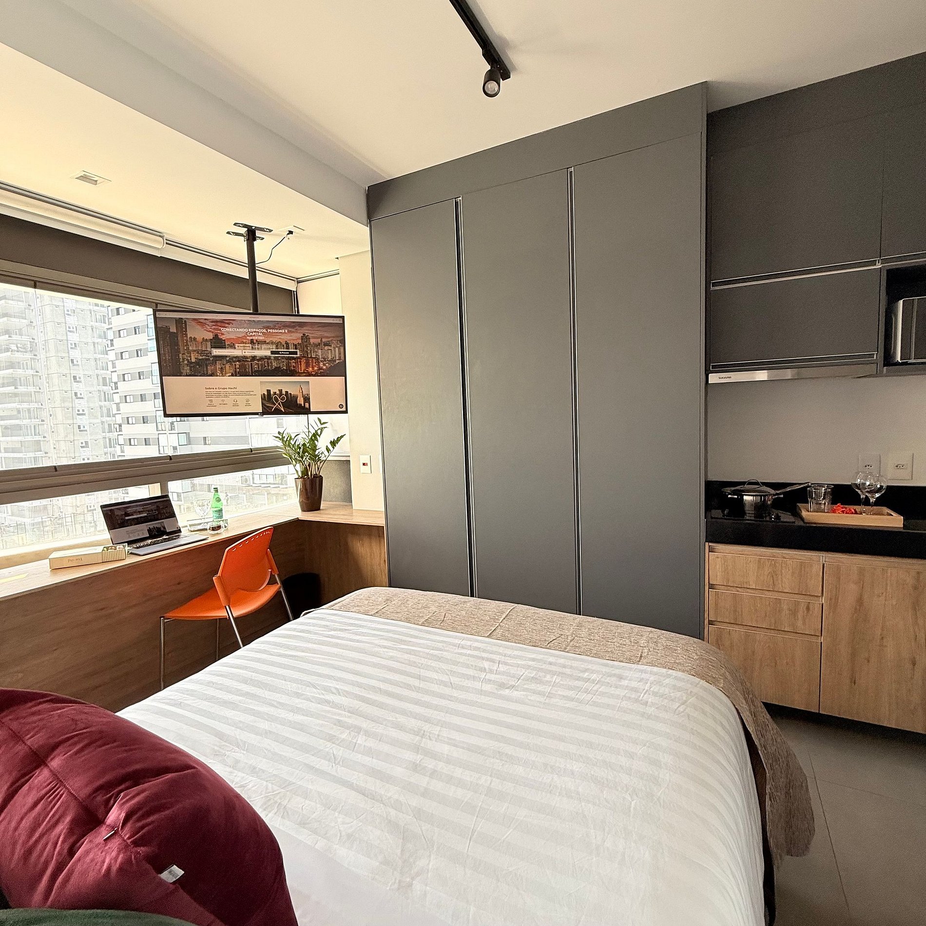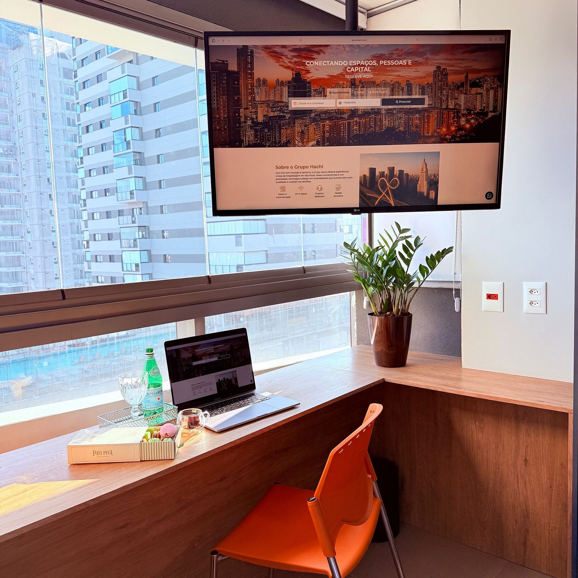 A Atmosfera Hachi 1606 é um refúgio suspenso sobre SP, onde o design encontra o silêncio interno e a cidade vira cenário. A Atmosfera têm cama de hotel 5 estrelas, veludo que abraça, luz que acaricia, e um skyline que parece respirar com vc. Além disso, oferecemos O Ritual Atmosfera Hachi, que possui amenities Granado para um banho relaxante.