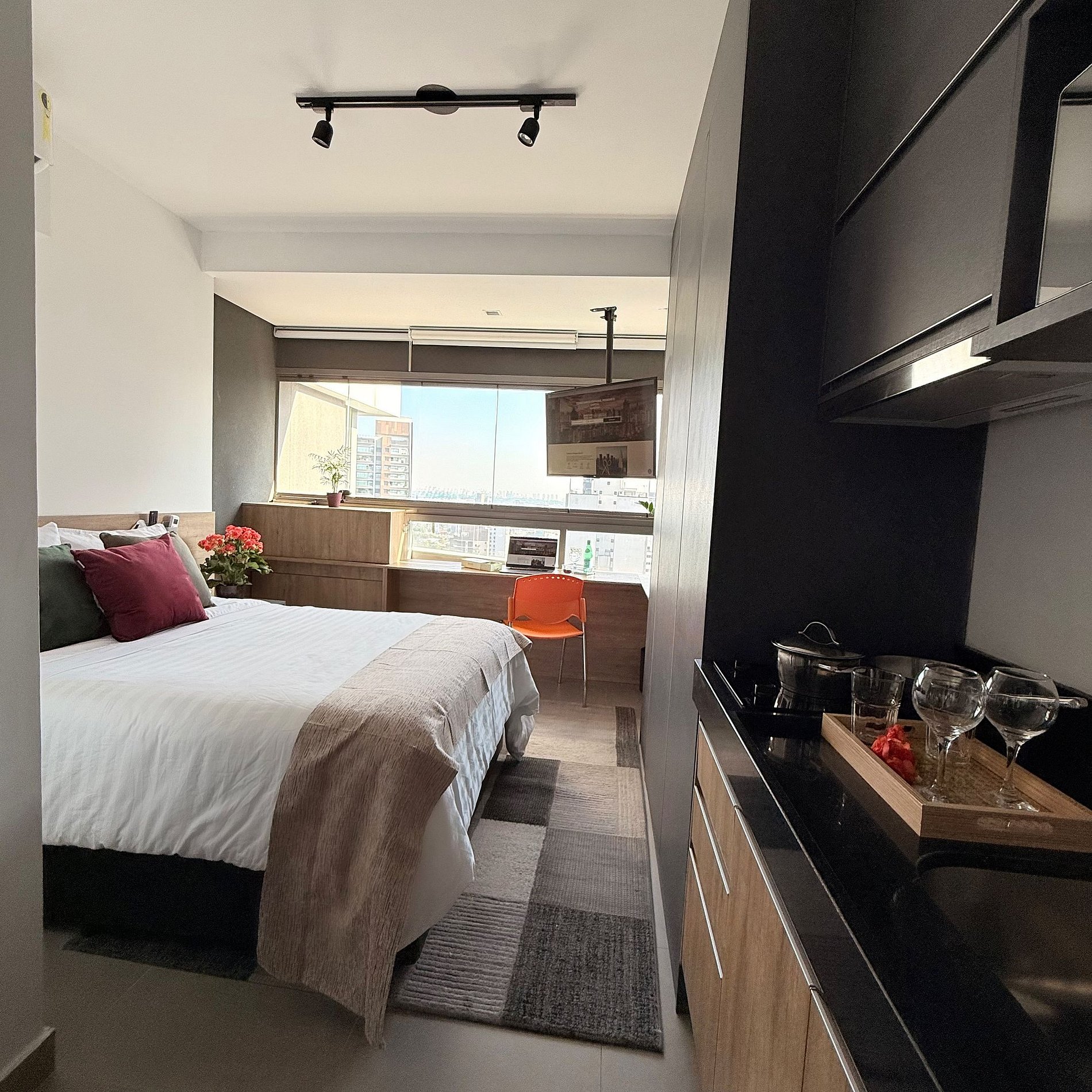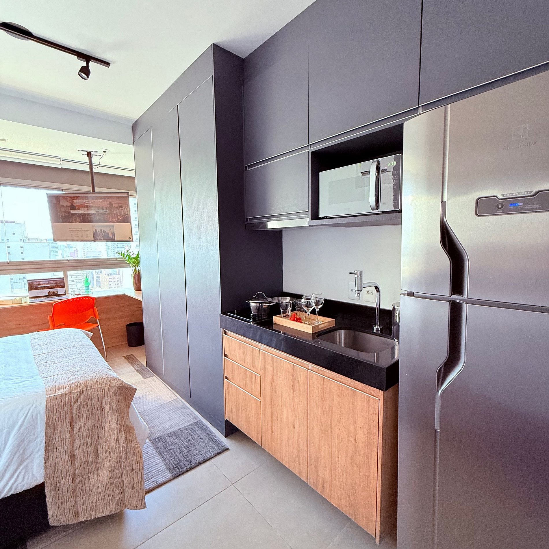 - Cozinha equipada com: air fryer, cafeteira, microondas, cooktop 2 bocas, panelas por indução;